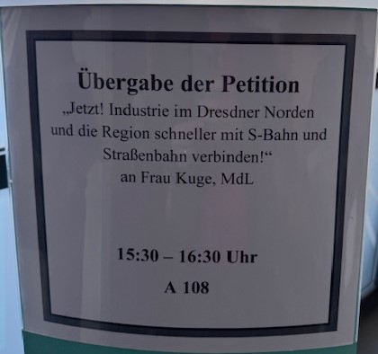 Am 4. März 2026 hat der VCD (Verkehrsclub Deutschland) rund 2.500 Unterschriften für eine bessere Schienenanbindung des Dresdner Nordens an den Petitionsausschuss des Sächsischen Landtags übergeben. Die AG nachhaltig mobil und der VCD starteten die Petition im Jahr 2024 gemeinsam und sammelten viele Unterschriften. Es gab vor der Petitionsübergabe mehrere Hintergrundgespräche an verschiedenen Stellen. Nun wurde die Petition im Sächsischen Landtag offiziell übergeben.